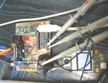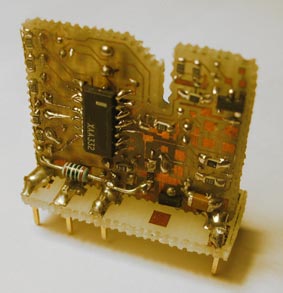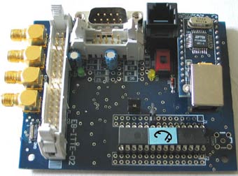 This is the finished module. On the bottom side there are many smd components. Many of these units are now installed as communication interfaces. They are performing the final tests of the mobile phones in manufacturing plants at several locations in the world. The small "piggy-back" module up to the right, is a USB to parallel interface unit that also was developed. That module is now available as standard Electrobrains' product. |